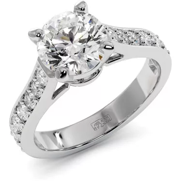 An amazing stylish engagement ring features a 5ct lab-grown diamond center stone and complemented by totally 1.2 carat of round lab-grown diamond stones in 18k white, yellow or rose gold.